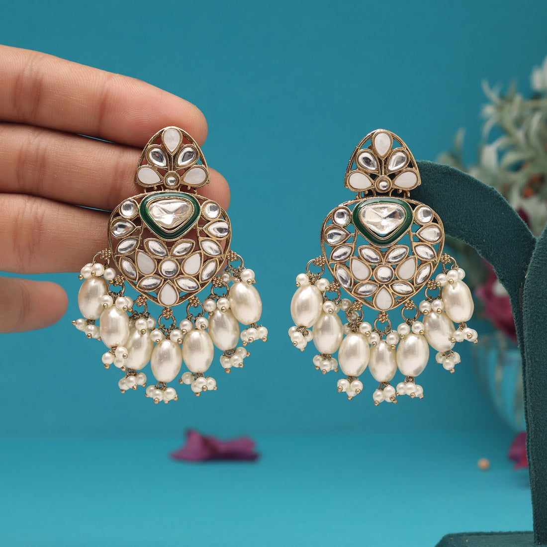 Green & White Color Kundan Earrings