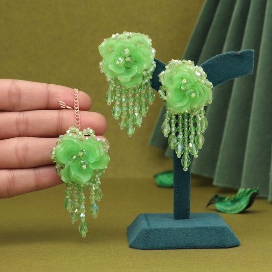 Parrot Green Color Stone Earrings With Maang Tikka