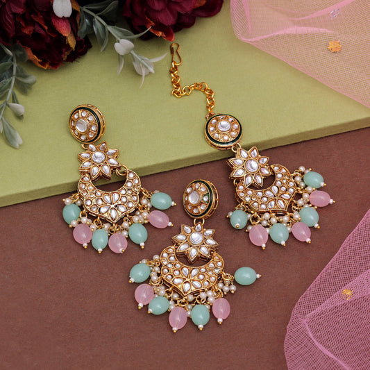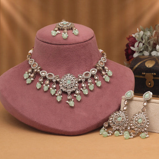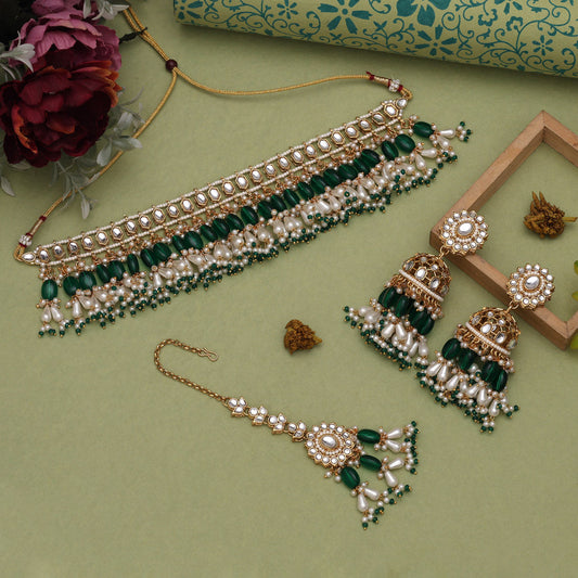 Green Color Kundan Necklace With Earring & Maang Tikka