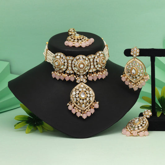 Pink Color Choker Kundan Necklace Set With Pearl Bead Droplets