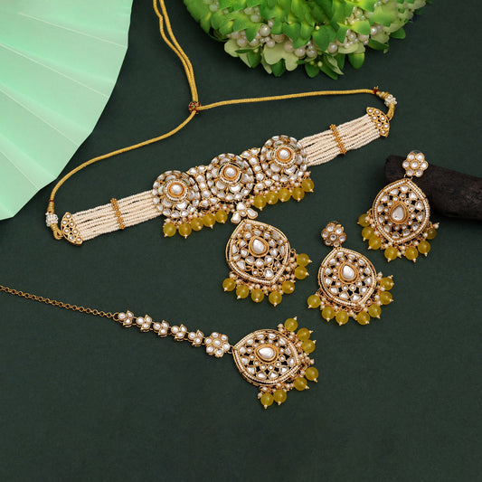 Yellow Color Choker Kundan Necklace Set For Haldi And Festive Looks