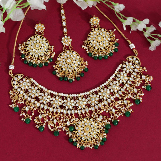 Green Color Choker Kundan Necklace Set With Traditional Temple Jewelry Feel