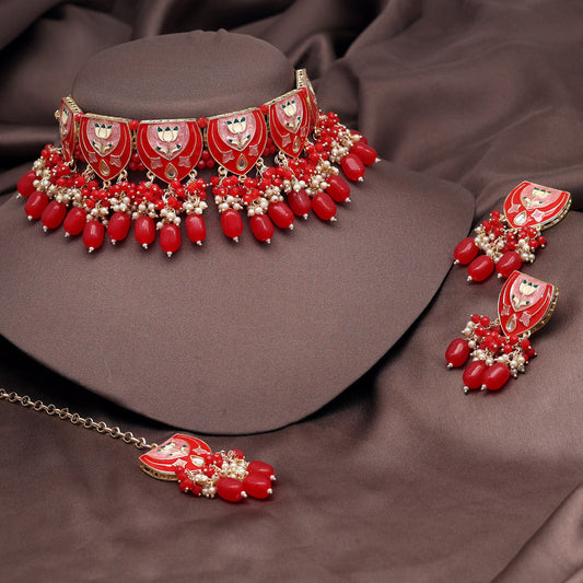Maroon & Green Color Choker Kundan Necklace Set With Rich Detailing