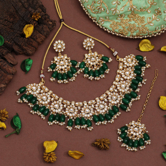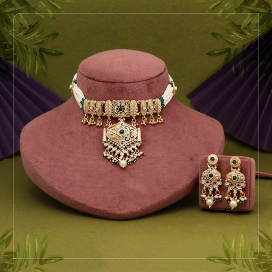 Green Color Meena Work Choker Matte Gold Rajwadi Temple Necklace Set