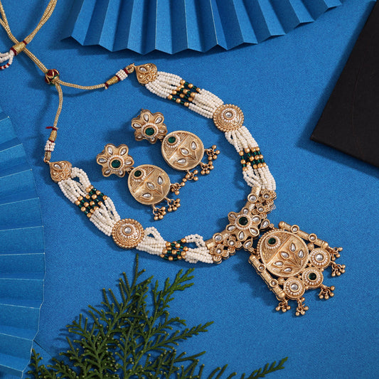 Green Color Matte Gold Rajwadi Temple Necklace Set