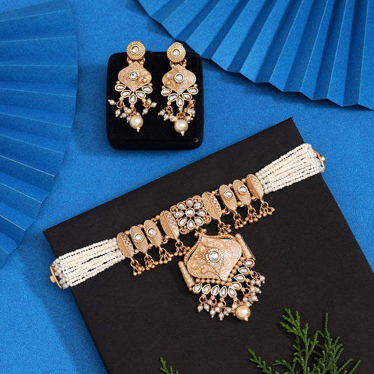 Regular price ₹945.00 INRRegular priceUnit price / per₹1,310.00 INRSale price ₹945.00 INRGold Color Royal Choker Kundan Necklace Set