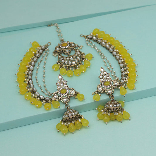 Yellow Color Kundan Earrings With Maang Tikka (KDTE561YLW)