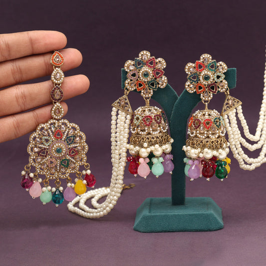 Multi Color Pakistani Kundan Earrings With Maang Tikka (KDTE579MLT)
