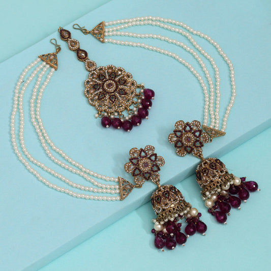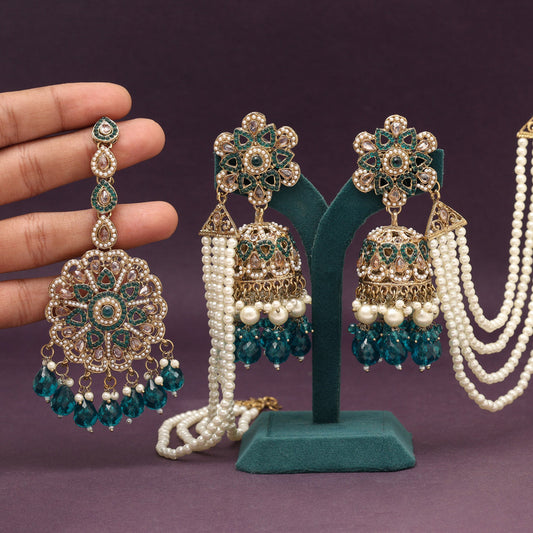 Blue Color Imitation Pearl & Kundan Necklace With Earrings & Maang Tikka