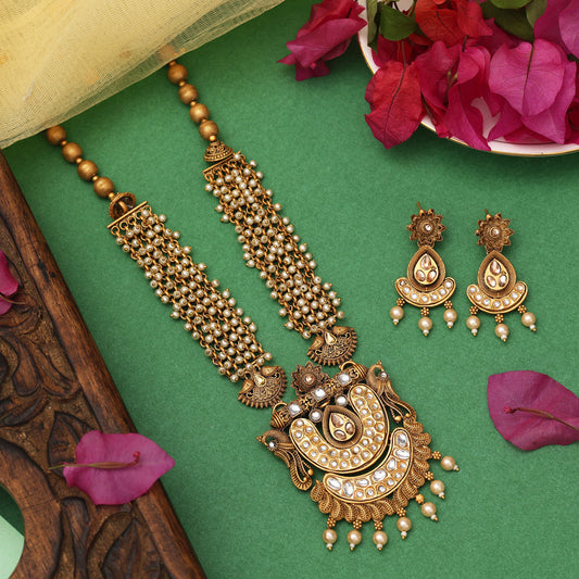 Gold Color Vilandi Kundan Matte Gold Rajwadi Temple Necklace Set (TPLN331GLD)