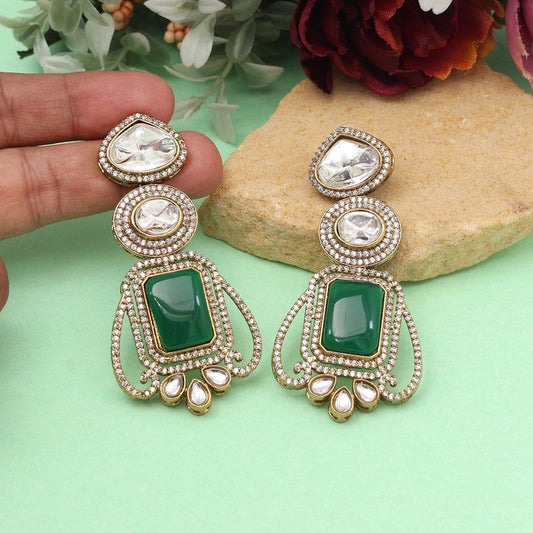 Green Color Royal Look Handmade Jaipur Earrings On Brass Metal With Moissanite Kundan And Monalisa Stones Studded On Apala Polish