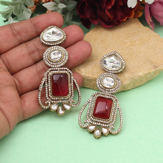 Red Color Royal Look Handmade Jaipur Earrings On Brass Metal With Moissanite Kundan And Monalisa Stones Studded On Apala Polish (ADE610RED)