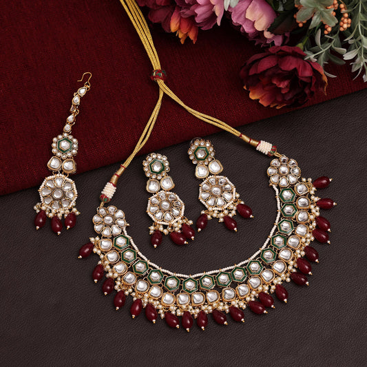 Maroon Color Meena Work Kundan Necklace Set (KN1392MRN)