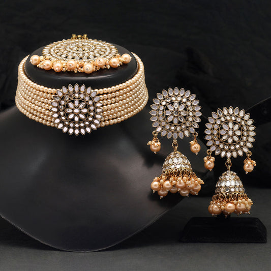 Gold Color Kundan Mirror Choker Necklaces Set (MRN145GLD)