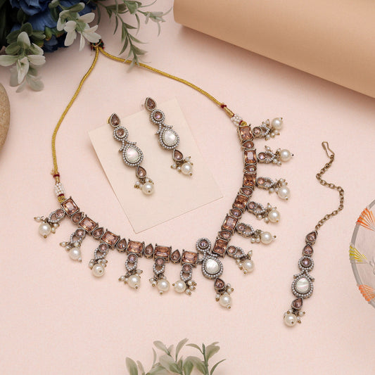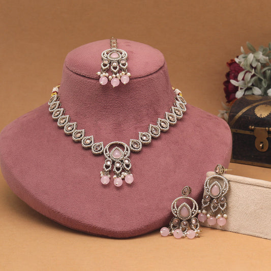 Graceful Pink Color American Diamond Necklaces Set With A Unique Pattern