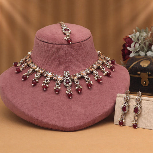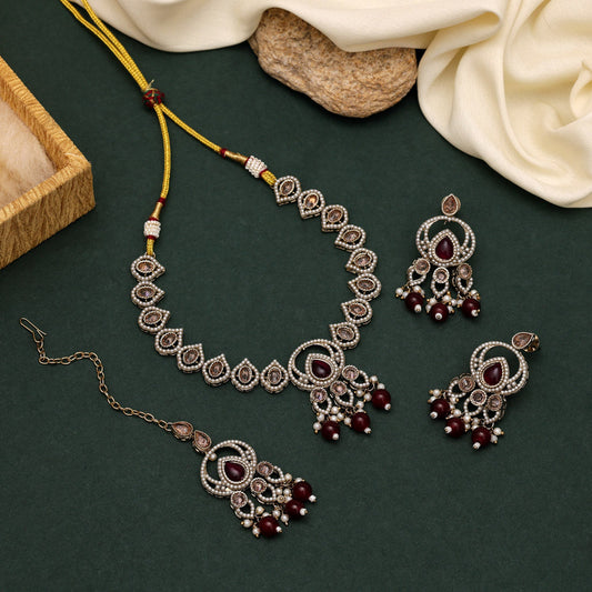Sophisticated Maroon Color American Diamond Necklaces Set For Grand Events