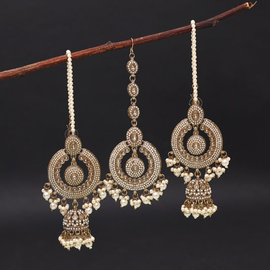 White Color Kundan Earrings With Maang Tikka (KDTE578WHT)
