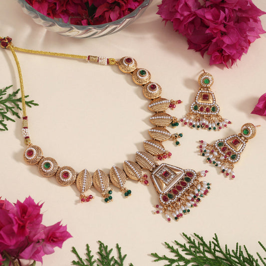 Maroon & Green Color Vilandi Kundan Matte Gold Rajwadi Temple Necklace Set (TPLN318MG)