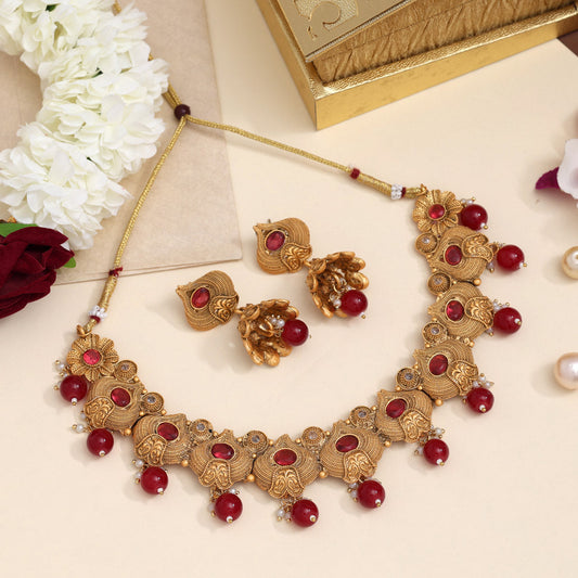 Maroon Color Matte Gold Rajwadi Temple Necklace Set