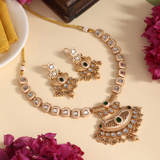 Green Color Matte Gold Rajwadi Temple Necklace Set
