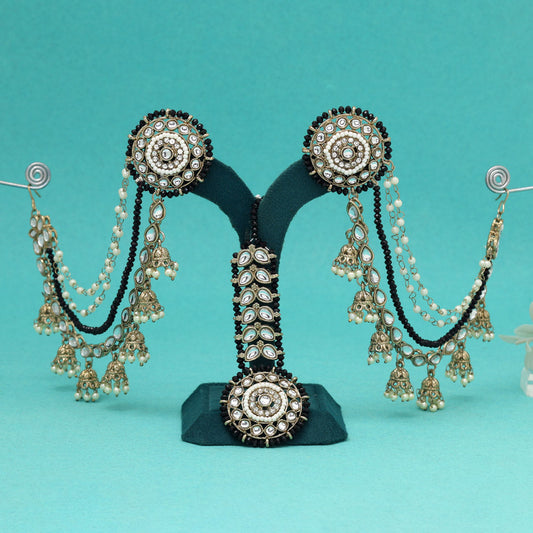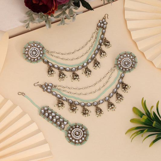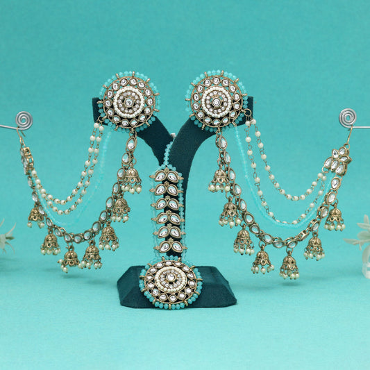Ocean Firozi Color Kundan Earrings With Maang Tikka