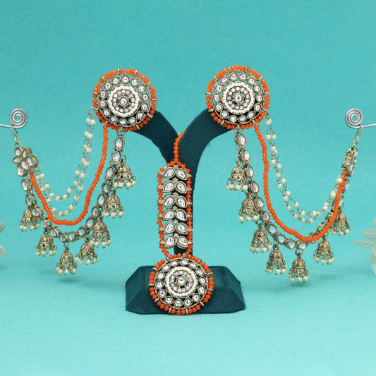 Vibrant Orange Color Kundan Earrings With Maang Tikka