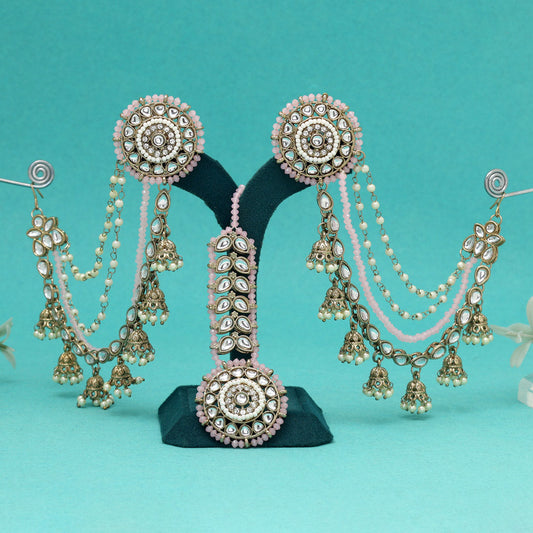 Soft Pink Color Kundan Earrings With Maang Tikka