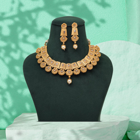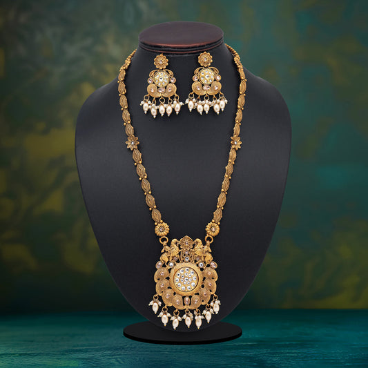 Gold Color Vilandi Kundan Matte Gold Rajwadi Temple Necklace Set (TPLN323GLD)