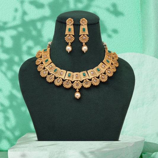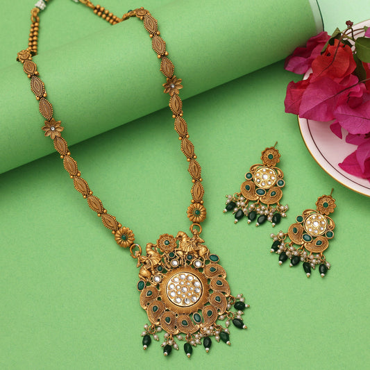 Green Color Matte Gold Rajwadi Temple Necklace Set