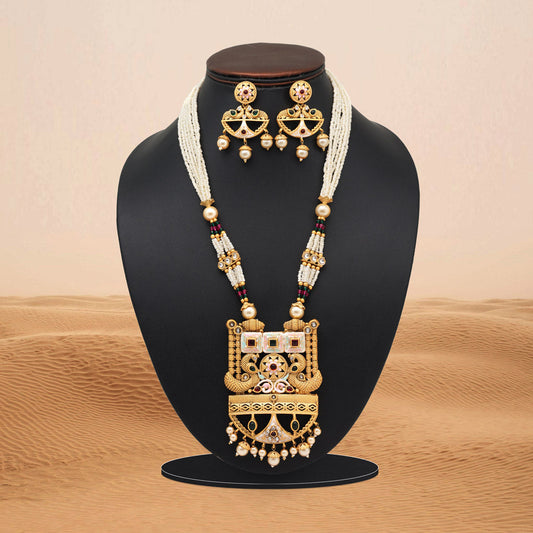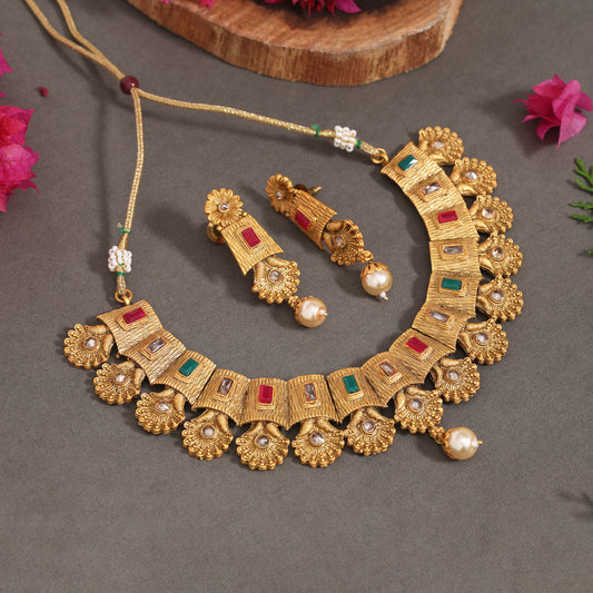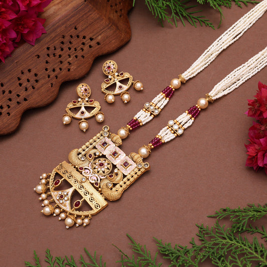 Gold Color Meena Work Matte Gold Rajwadi Temple Necklace Set