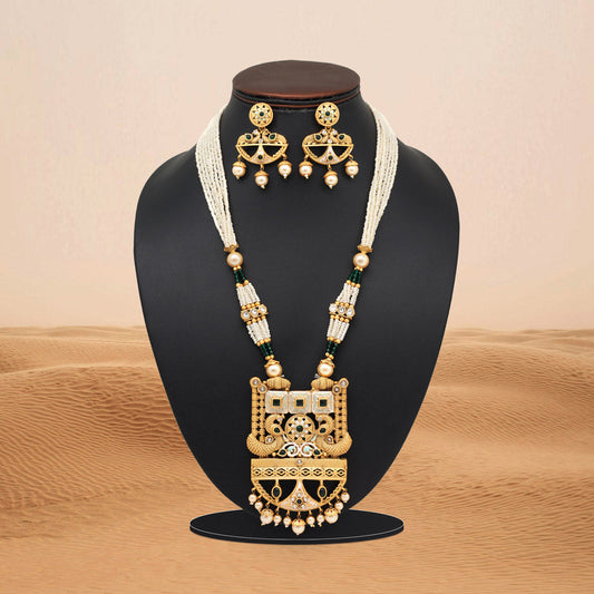 Green Color Vilandi Kundan Matte Gold Rajwadi Temple Necklace Set