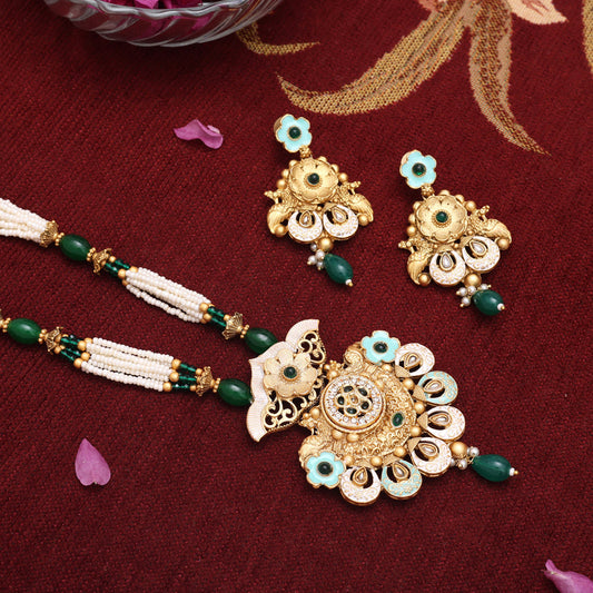 Green Color Meena Work Matte Gold Rajwadi Temple Necklace Set