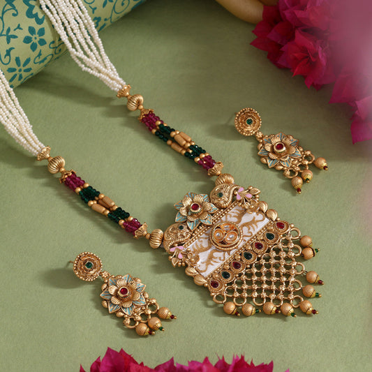Multi Color Meena Work Matte Gold Rajwadi Temple Necklace Set