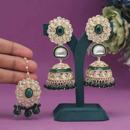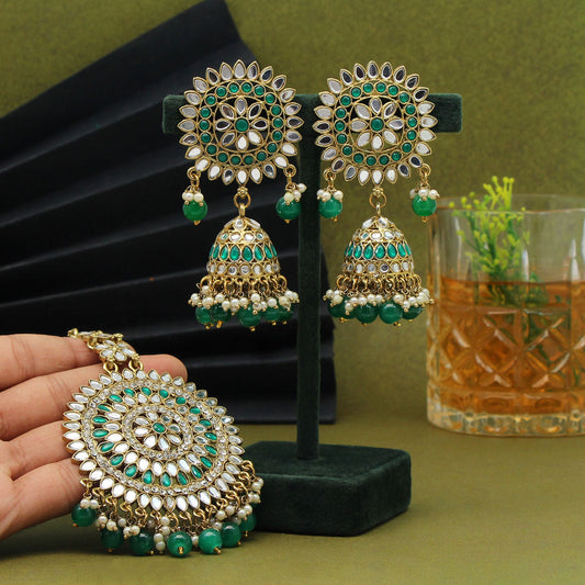 Green Color Mirror Kundan Earrings With Maang Tikka