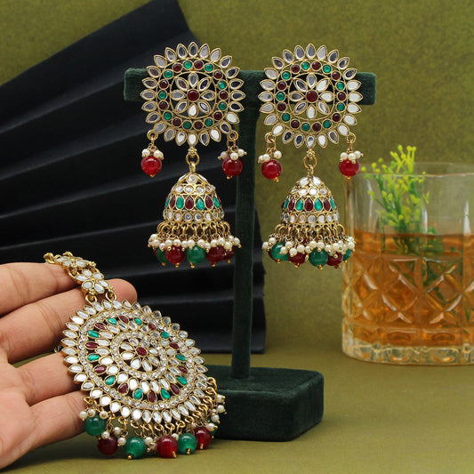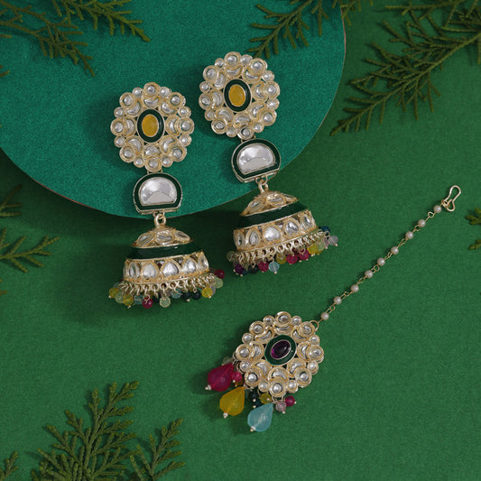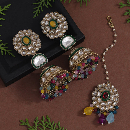 Multi Color Kundan Earrings With Maang Tikka (KDTE556MLT)