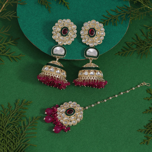 Rani Color Kundan Earrings With Maang Tikka (KDTE556RNI)