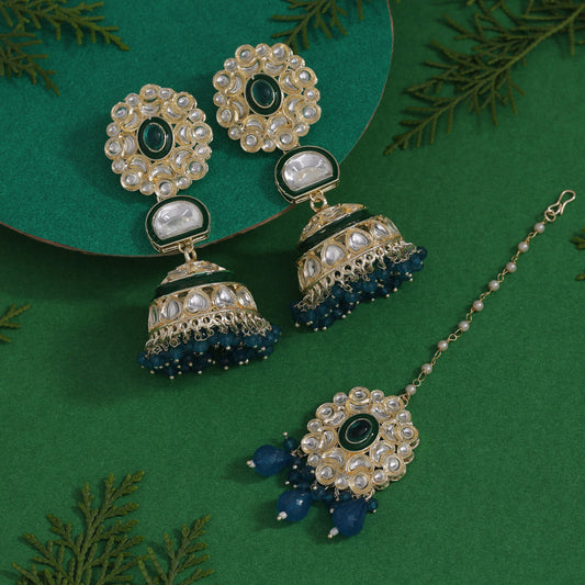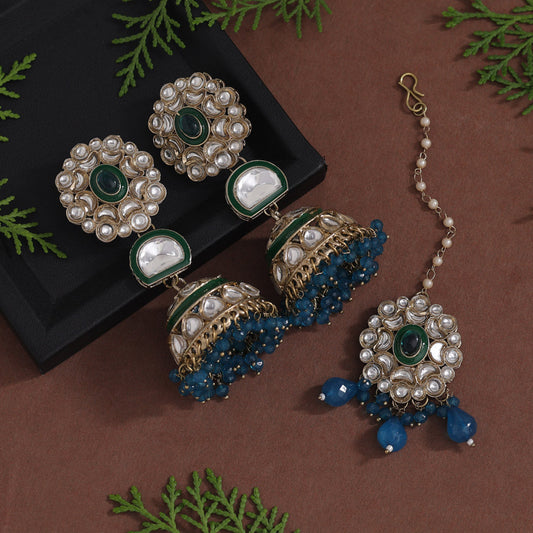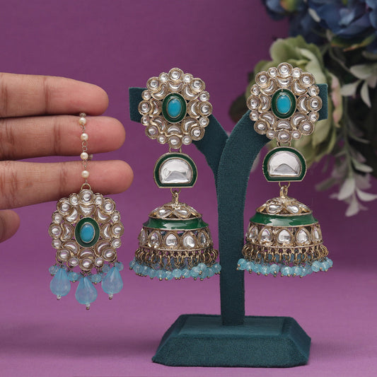 Turquoise Blue Color Kundan Earrings With Maang Tikka