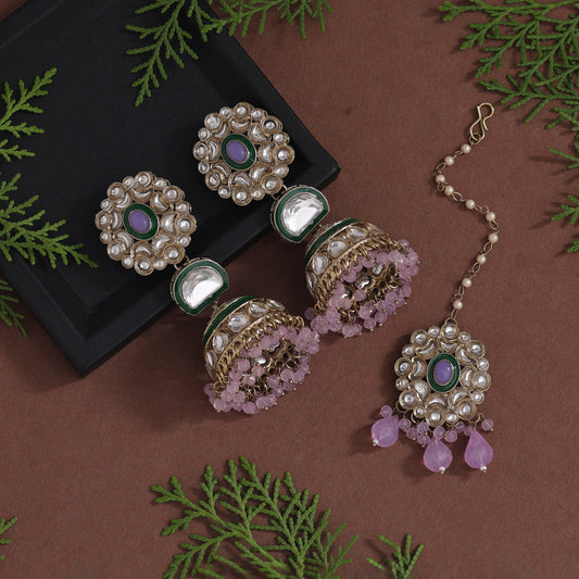 Pink Color Kundan Earrings With Maang Tikka (KDTE556PNK)