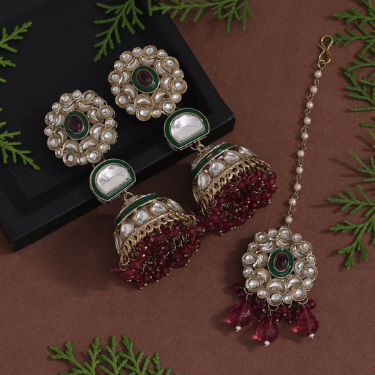 Maroon & Green Color Mirror Kundan Earrings With Maang Tikka (MTKE459MG)