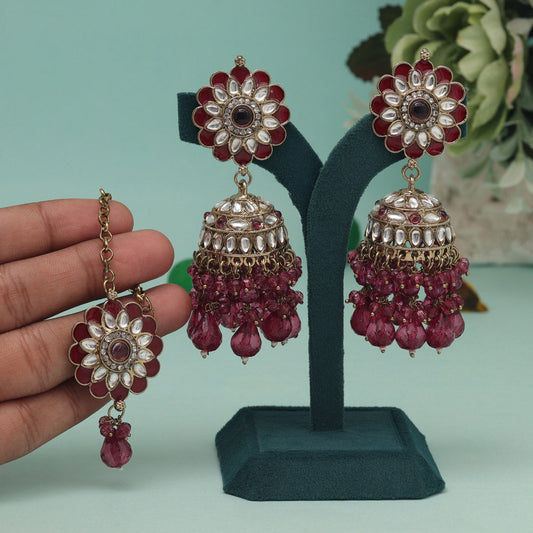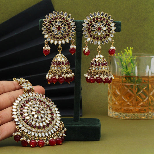 Maroon Color Mirror Kundan Earrings With Maang Tikka