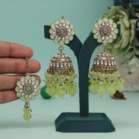 Pista Green Color Kundan Earrings With Maang Tikka (KDTE556PGRN)
