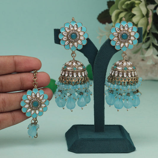 Sky Blue Color Kundan Earrings With Maang Tikka
