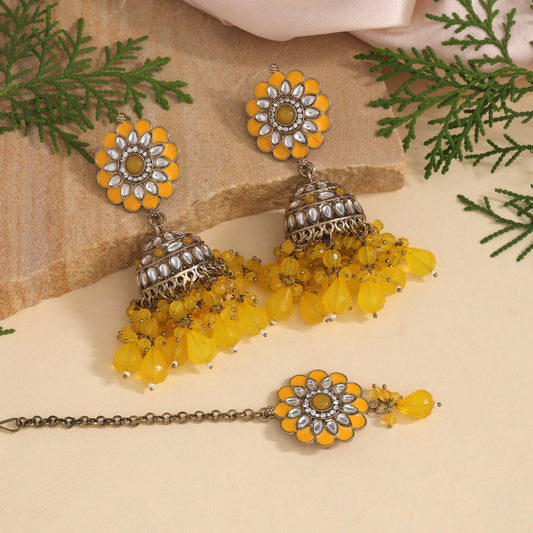 Yellow Color Mirror Kundan Earrings With Maang Tikka (MTKE459YLW)