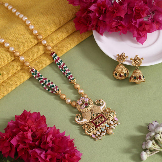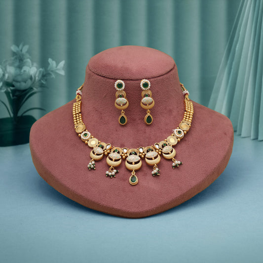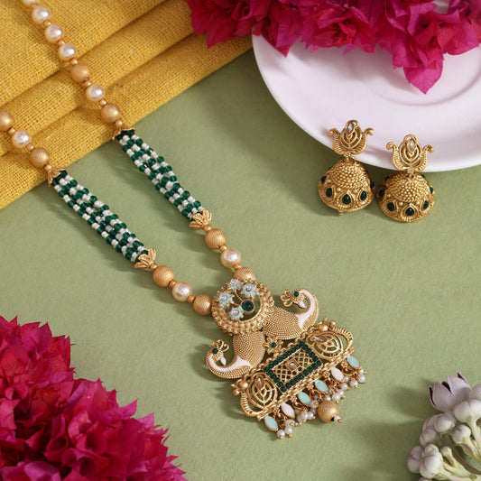 Green Color Matte Gold Rajwadi Temple Necklace Set