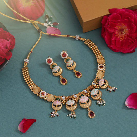 Rani Color Matte Gold Rajwadi Temple Necklace Set