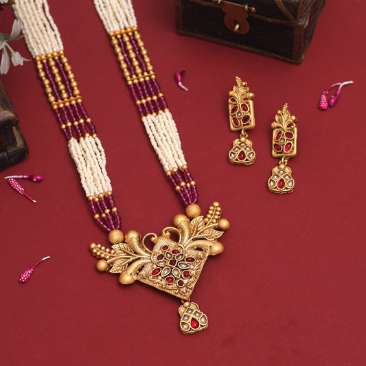 Maroon & Green Color Matte Gold Rajwadi Temple Necklace Set