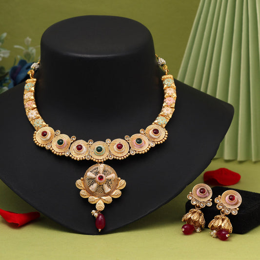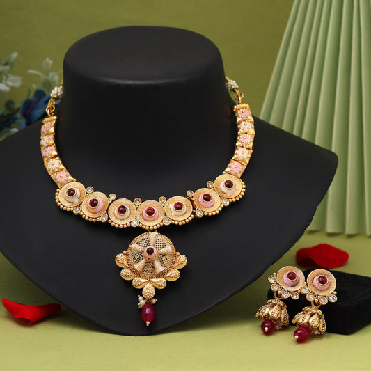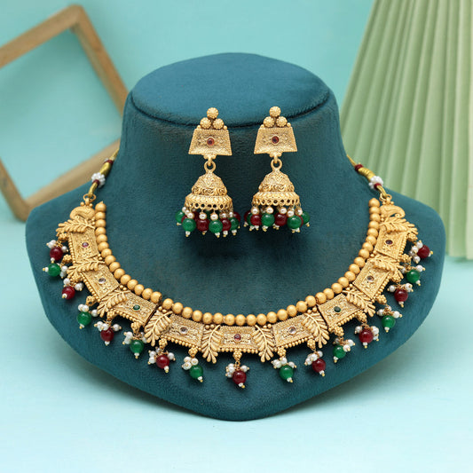 Rani Color Rajwadi Matte Gold Necklace Set (TPLN639RNI)