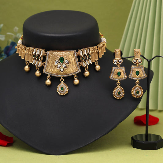 Green Color Choker Matte Gold Rajwadi Temple Necklace Set (TPLN680GRN)