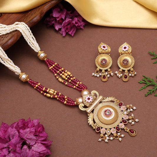 Rani Color Meena Work Matte Gold Rajwadi Temple Necklace Set