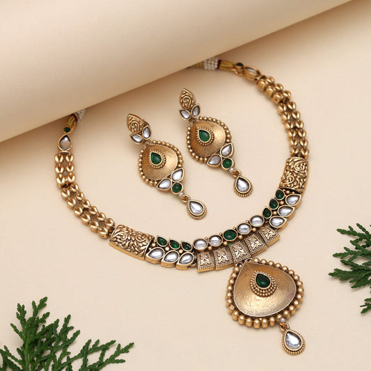 Green Color Matte Gold Rajwadi Temple Necklace Set (TPLN719GRN)